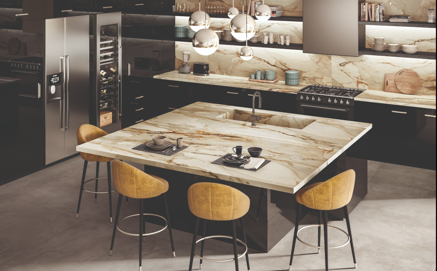 This slab is especially well suited for modern, marble-effect kitchens, instantly elevating the space with a timeless and elegant character. Its versatility makes it ideal for countertops, backsplashes, and full-height cladding, adapting seamlessly to a wide range of applications.